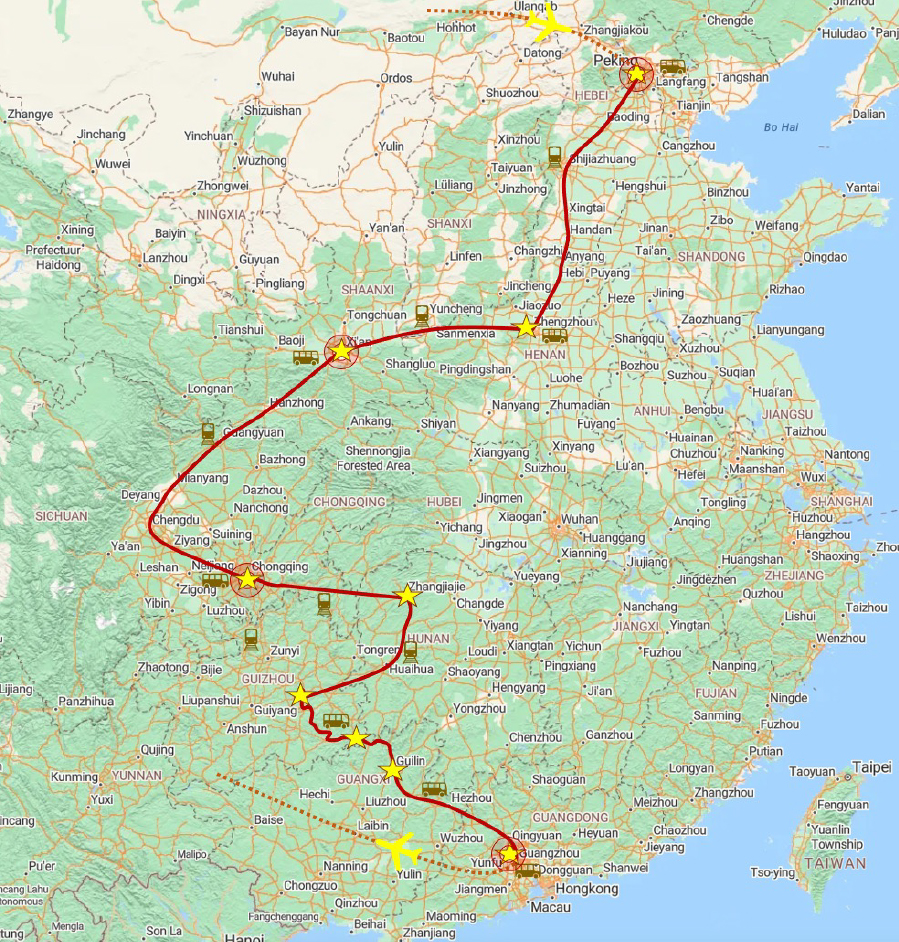 In deze reis maken we een dwarsdoorsnede door China van Noord naar Zuid, waarbij we zeer uiteenlopende gebieden bezoeken, elk met een ander karakter. We beginnen en eindigen in gebieden die tot de motoren van China’s opkomst behoren, Beijing en Guangzhou in de Parel Rivier delta. Daartussen in gaan we op ontdekkingstocht in China’s binnenland. We bezoeken de steden Zhengzhou, Xi’an, de megastad Chongqing op de grens tussen Centraal en West China, en het zuidelijke Guilin. In Guizhou, nog steeds één van de minst rijke provincie’s, doorkruisen we het platteland en bezoeken we meerdere dorpen en stadjes, gelegen in een fabelachtig berglandschap.